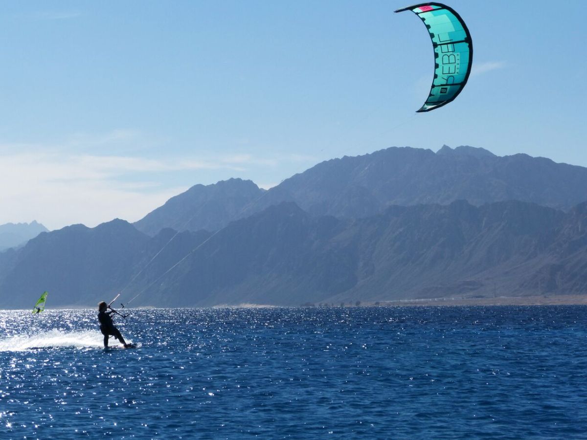 Kitesurfing on transparent waters: Steady winds and open water make kitesurfing one of the most exciting and sought after activities at Blue Lagoon Dahab.